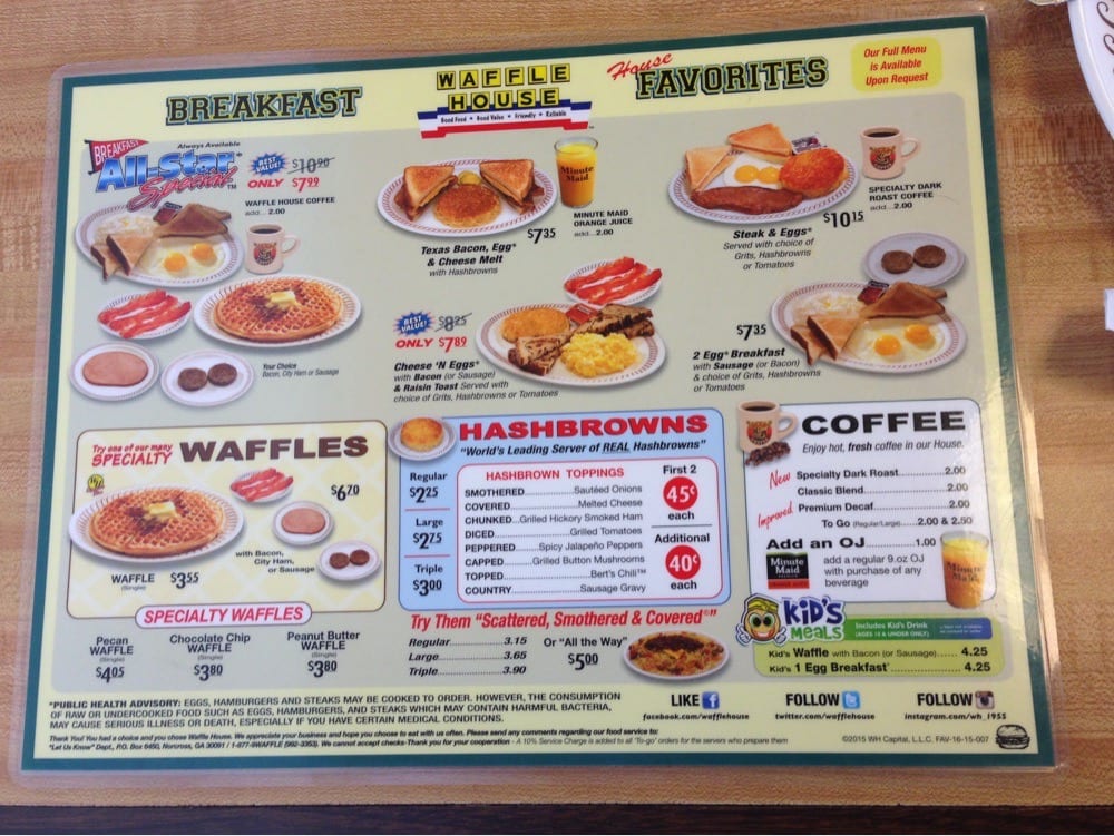 Introducing the menu at Waffle House - Littleton, a charming hub for breakfast and brunch lovers in the heart of Littleton, CO. Renowned for its casual atmosphere, Waffle House beckons diners with a delightful selection of hearty American dishes. Whether you're craving their classic waffles, a savory patty melt, or perfectly scattered and smothered hash browns, each plate promises to be fresh and satisfying.